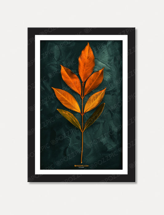 Expertly designed, this orange and green leaf rests on a striking black background, showcasing its...